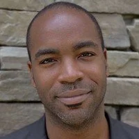 • Close-up of a man with dark skin and a shaved head, standing outdoors in front of a stone wall.