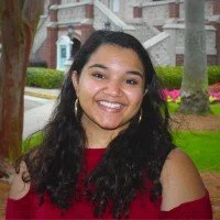 • A young woman with long dark hair smiling outdoors in front of trees and a building.